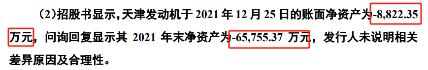 另外,招股书显示,天津发动机于2021年12月25日的账面净资产为-8822.35万元,问询回复显示其2021年末净资产为-6.58亿元,相差了6倍以上。而公司未说明相关差异原因及合理性。